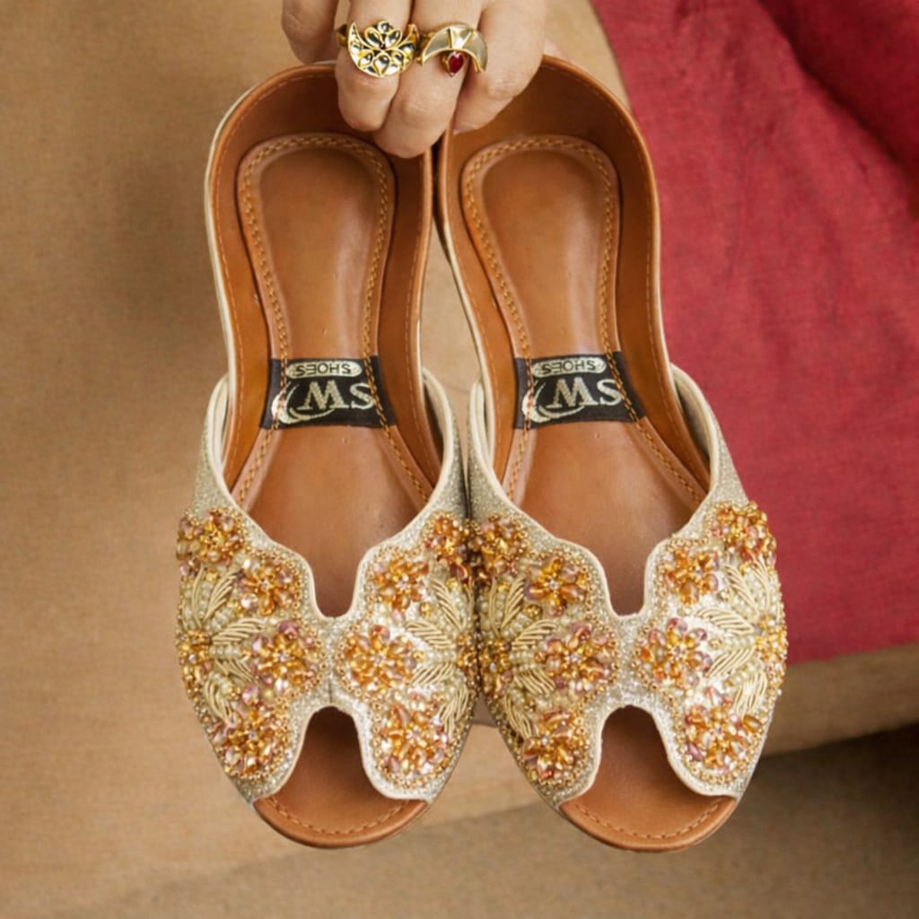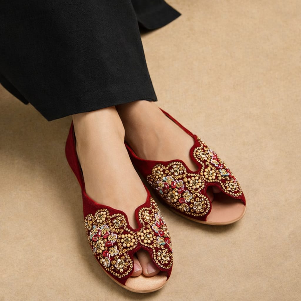 A beautifully handcrafted different colours jutti featuring elegant golden, pearl, and bead embroidery that adds a royal touch to your festive and bridal look.