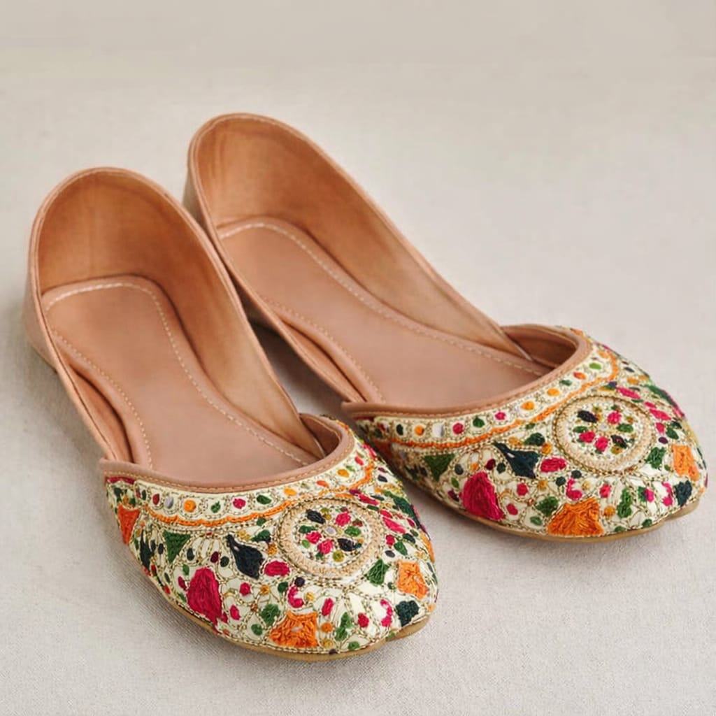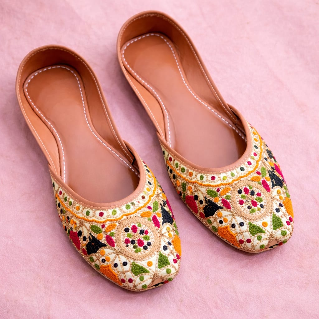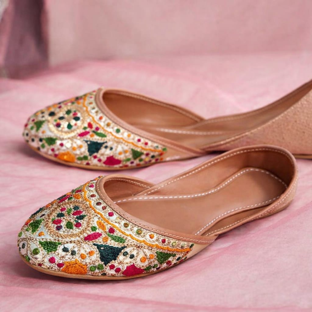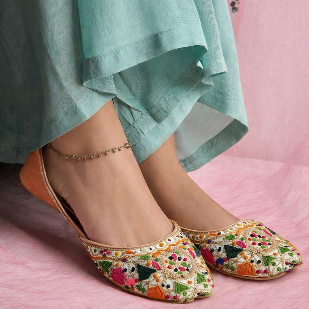 Verdant Loom is a refined fusion of heritage craftsmanship and modern luxury. Featuring a deep black base enriched with intricate multicolor threadwork, this khussa reflects understated elegance with a bold artistic soul. The clean silhouette and detailed texture make it a versatile statement piece for both festive and contemporary wear.